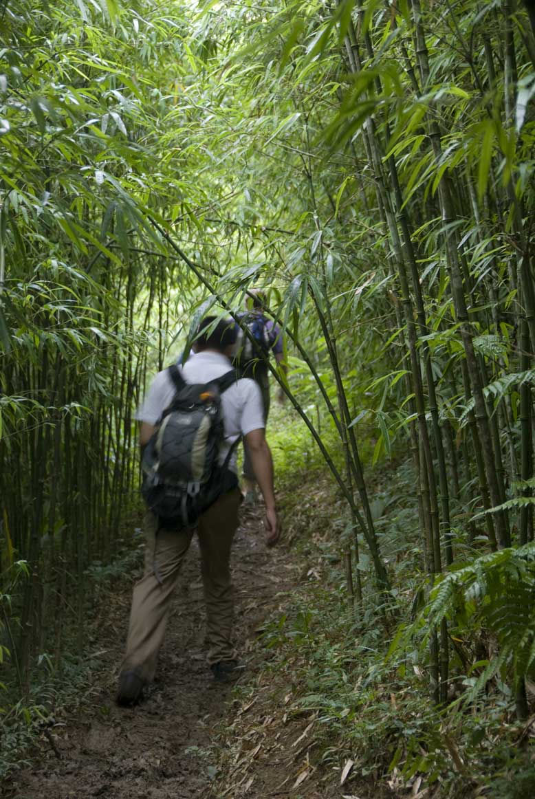 Nobody was much interested in a shower so we set off along the path through the village, turning almost immediately up the face of the hill, and hiked up to where the mud trails started. Clay has a way of being uselessly thick when rained upon, but once again we were lucky, and apart from the occasional slippery spot we had no problems at all. Xuan (whom I mistakenly referred to as Suan with an S previously) had a great time pointing out which flowers were poisonous and could be taken for insomnia.