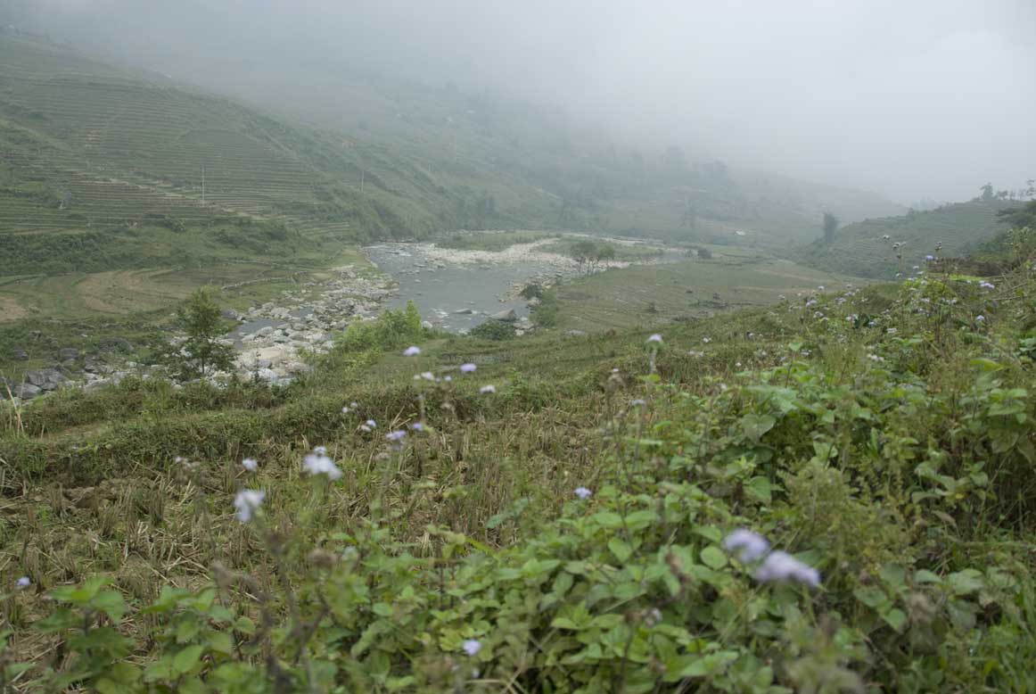 Back down the hill we came to another bridge back across the river, which meant that we had nearly walked as far as the main road and the bus back to Sapa, and a slightly more insistent rain had begun. We stopped for a little look at the river and the rocks before continuing on up hill, looking back regularly down the path and at the magnificent valley. It wasn’t very far back up to the main road, and in the bus it wasn’t very far back to Sapa (10km). We were back in our comfy, damp, cannot-possibly-dry-any-washing room by about 1.30, but we were starving and went walking up the main street for lunch. The place we stopped was actually very nicely decorated but that didn’t mean we couldn’t get lunch for about 70,000VND.