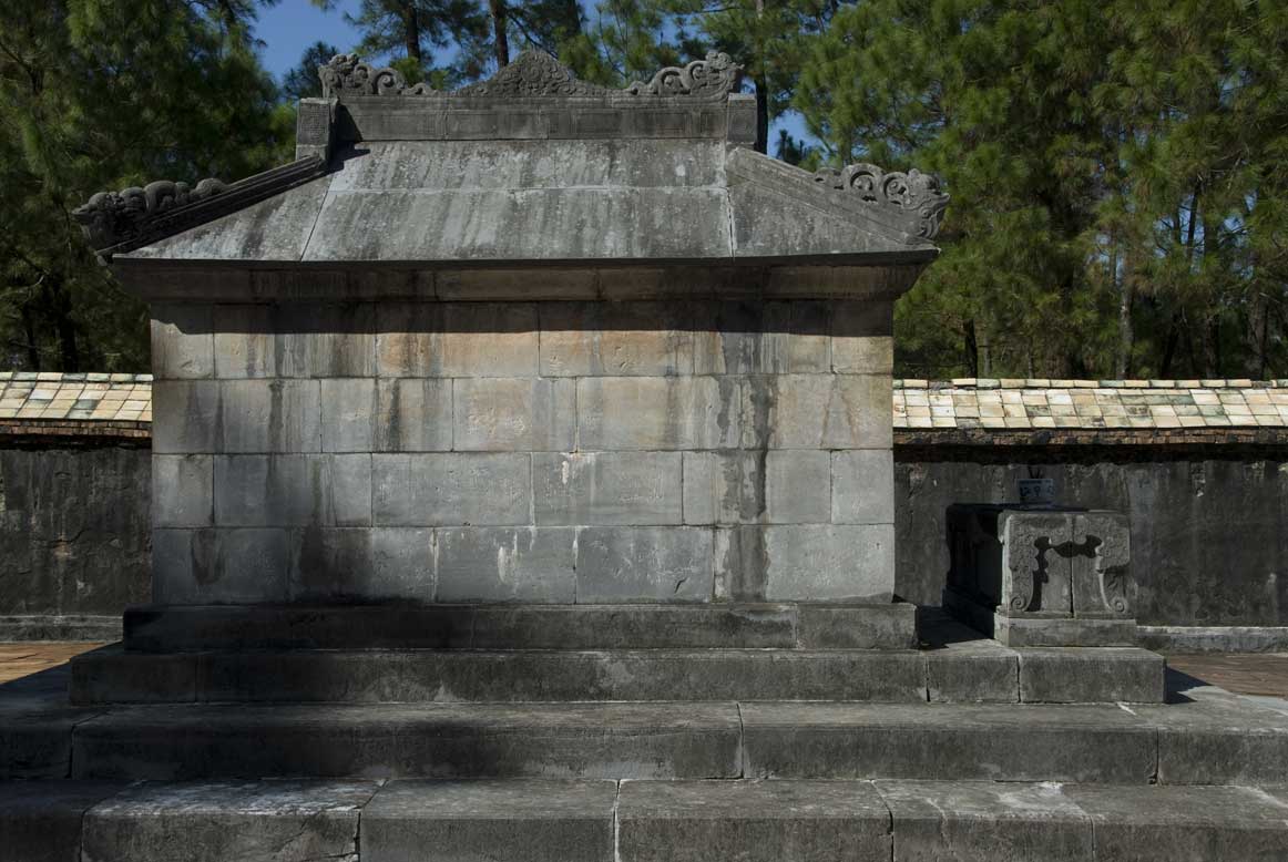 There are ten stone statues, and the elephants they rode in on, guarding the entrance to the walled section which houses Tu Duc’s surface tomb. Just as in Xi’an, they have different ranks which can be told by their uniforms and hairstyles, but unlike the Terracotta Warriors there aren’t 6,000 of them and they are built to be respectfully slightly shorter than the Emperor was. So that’s how they know Tu Duc was less than 5’2″. Up the stone steps there is a colonnade, with four pillars, and inside is Tu Duc’s last poem, inscribed in Mandarin on a huge tablet, of more than 5,000 characters, in which he regrets being a B-grade Emperor, and ceding the whole country to the French, due to spending all his time at the Summer Palace having naptime and composing poems. How long it took him to compose, and what the French were up to during this time period, is not really worth discussing.